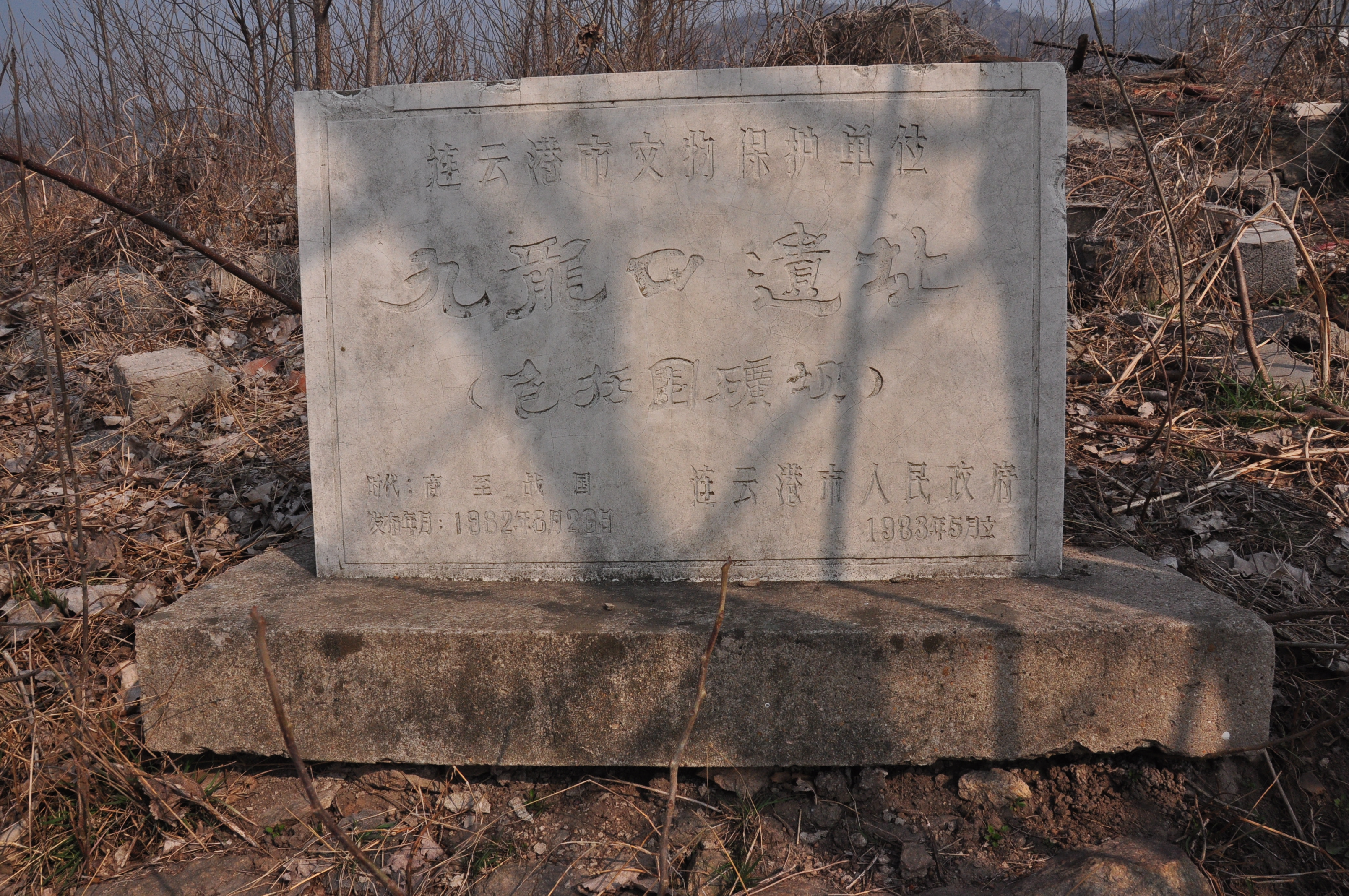 位于连云港市海州区锦屏镇陶湾村,在锦屏山东侧一个背风、向阳、名叫九龙口的谷地中。面积约15万平方米。九龙口遗址于1957年曾出土过一套战国编钟和商代的陶器、铜镞及战国陶片。其中一件红砂质分裆陶鬲,可见东夷文化的端倪。此遗址对探索东夷文化有重要价值。